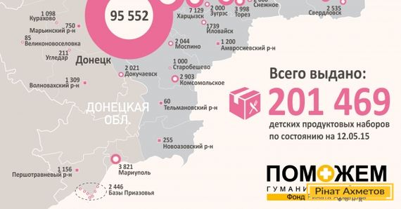 As of May 12, 2015, Rinat Akhmetov Humanitarian Center issued 201,469 children packages to families with children under 2 years old, who live in Donetsk and Luhansk regions, and IDPs from Donbas. The issuance started in August 2014, when the first convoy of Humanitarian Aid Drive was sent to Donbas to deliver food for civilians.