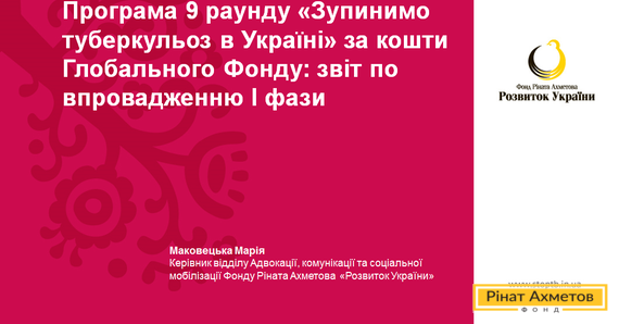 Maria Makovetska, Head of Advocacy, Communication and Social Mobilization team at "Stop TB in Ukraine" Program of the Rinat Akhmetov Foundation for "Development of Ukraine" highlighted the strategic goals and objectives of the Program, as well as reported on the successful implementation of the project. In particular, her presentation reflected the issues of laboratory system strengthening, enhancement of the monitoring and evaluation system, improvement of the treatment and social support to patients, as well as the results of a broad information campaign to combat tuberculosis.Also, the report includes Program indicators performance at the end of June 2013. Thus, for the period from the beginning of 2013 and to 30 June 2013, the Rinat Akhmetov Foundation received the highest overall rating for "Stop TB in Ukraine" Program implementation - A1, from the Global Fund.
