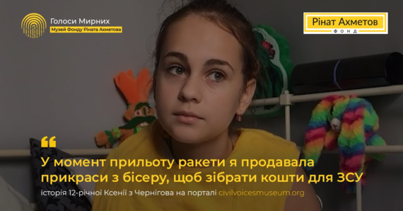 «У момент прильоту ракети я продавала прикраси з бісеру, щоб зібрати кошти для ЗСУ»: 12-річна Ксенія з Чернігова довірила свою історію Музею «Голоси Мирних» Фонду Ріната Ахметова