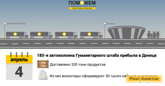 4 квітня до Донецька прибула 185-а автоколона Штабу Ріната Ахметова з гуманітарною допомогою. 16 фур доставили в логістичний центр на «Донбас Арені» 320 тонн продуктів.