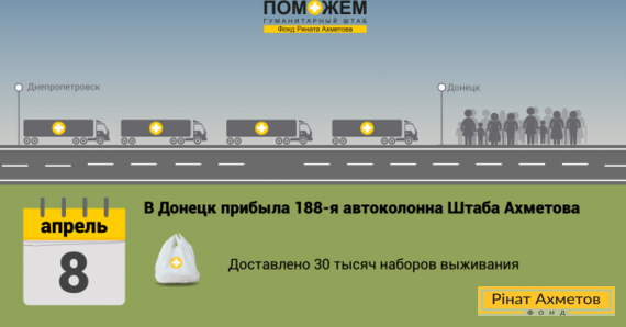 8 квітня до Донецька прибула 188-а автоколона Штабу Ріната Ахметова. 16 фур доставили 320 тонн продуктів для мирних жителів непідконтрольної території.