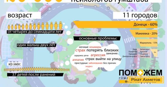 «Психологи Штабу Ріната Ахметова надають допомогу в дитячих садках Донецька й Макіївки. У цих же містах допомагають вагітним жінкам і молодим матусям у пологових будинках. Це не тільки групові заняття арт-терапією, а й серйозне індивідуальне опрацювання складних травматичних подій — загибель рідних, важкі поранення з фізичними каліцтвами. Ми плануємо до кінця року надати первинну психологічну допомогу 100 тисячам дітей, розширити географію надання допомоги. У планах вже в серпні розпочати роботу в Горлівці. Дітям подобається спілкуватися з психологами, а батьки вказують на позитивні зміни в їхній поведінці й дуже вдячні за допомогу Рінату Ахметову», — прокоментувала Дар’я Касьянова, керівник напряму «Психологічна допомога дітям» Гуманітарного штабу.