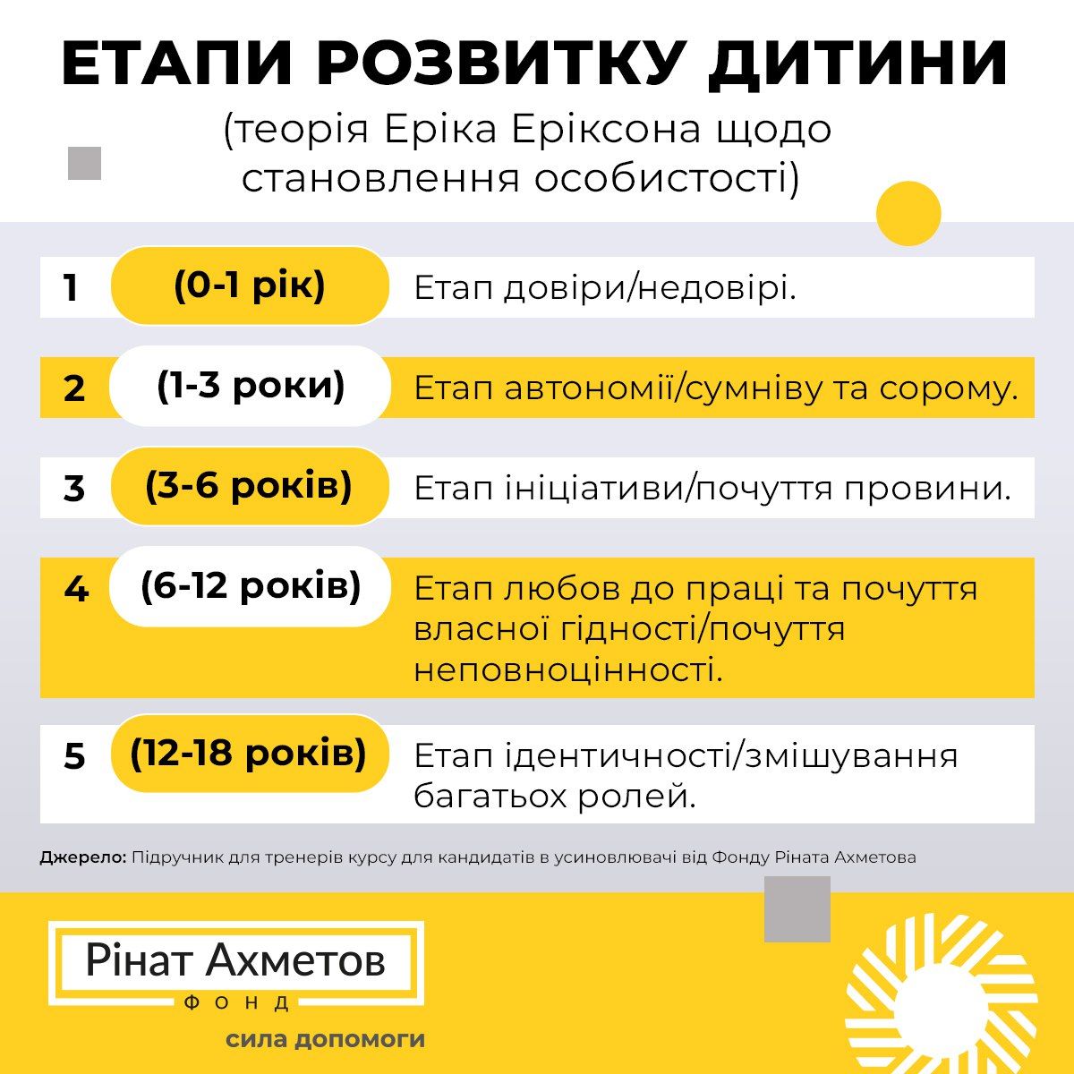 Наразі, зануремося в теорію відомого американського психолога Еріка Еріксона - автора концепції щодо періодів розвитку особистості. Адже не секрет, що усиновлювачі/опікуни/прийомні батьки беруть до себе в родину дитину, в якої травматичним був майже не кожен етап її розвитку.