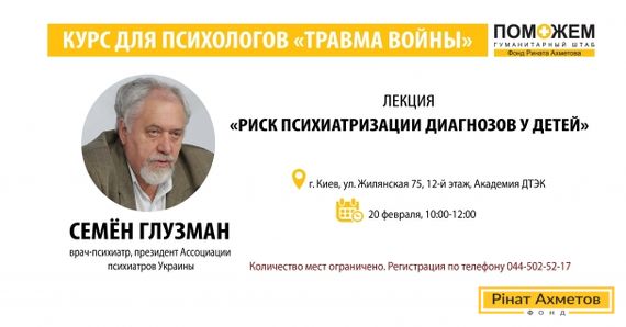 20 лютого, о 10:00–12:00, у Києві відбудеться лекція Семена Глузмана, лікаря-психіатра, президента Асоціації психіатрів України, на тему «Ризик психіатризації діагнозів у дітей». До участі запрошуються сімейні та дитячі психологи, соціальні працівники, фахівці, що працюють із дітьми.