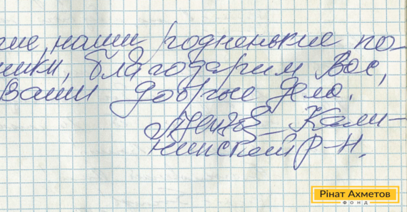 На адресу Гуманітарного штабу Ріната Ахметова прийшов лист від жителя Калінінського району Донецька. Він пише: «Дорогі наші, рідненькі помічники, дякуємо Вам за Ваші добрі справи».