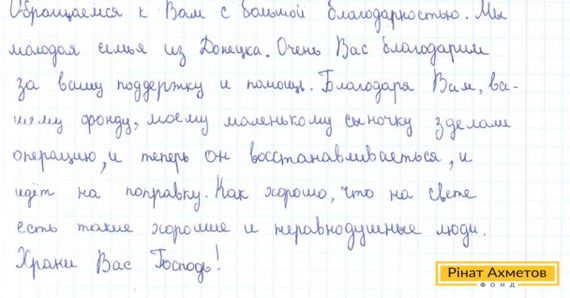 У Гуманітарний штаб Ріната Ахметова постійно приходять листи від людей, яким була надана допомога. Нещодавно нам написала родина з Донецька. Їхній дитині була необхідна операція. Родині надали допомогу.