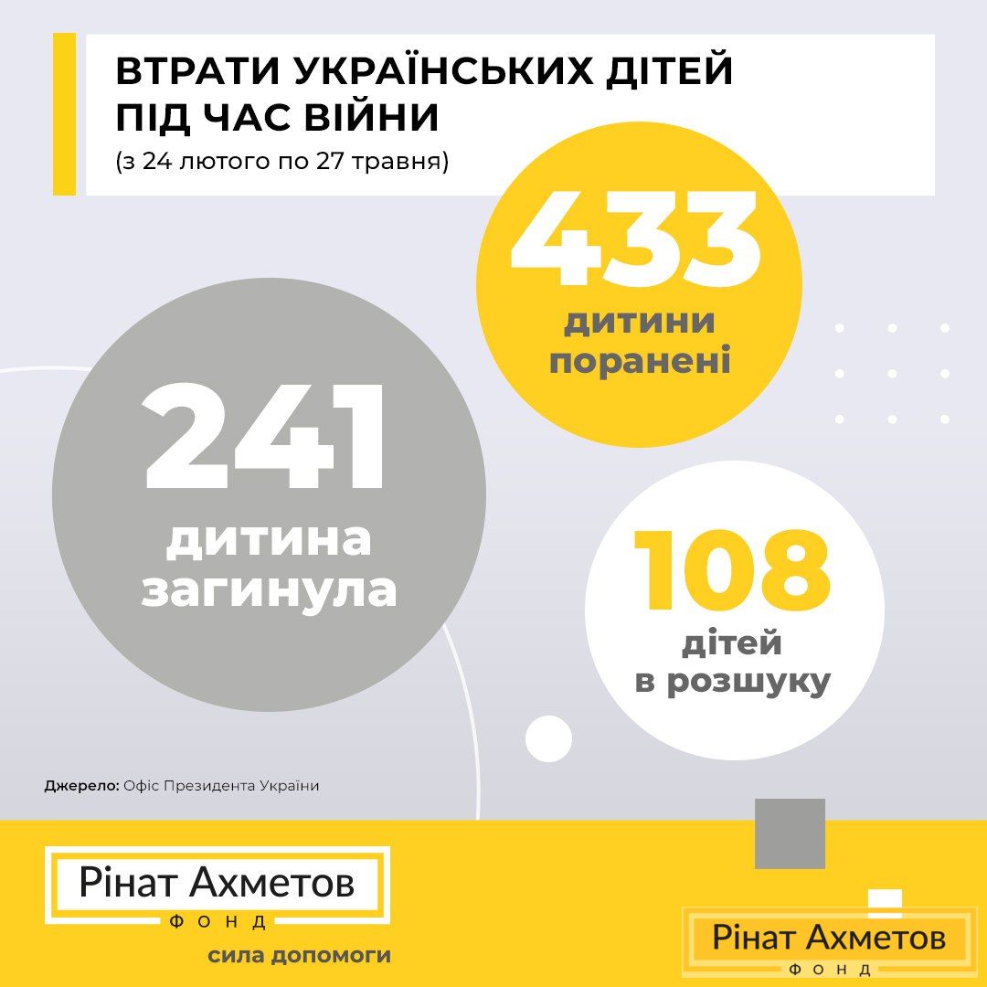 На превеликий жаль, я можу підтвердити дані про загибель 241 дитини і поранення 433 дітей. Чи є ці цифри остаточними? Звісно, ні. Адже ми ще не знаємо, яка точна кількість загиблих та поранених дітей на тимчасово окупованих територіях.