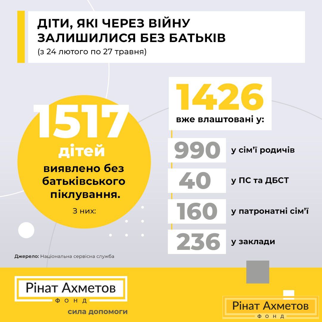 - За оперативними даними Національної соціальної сервісної служби України (без урахування інформації від кількох областей), від початку війни виявлено 1 517 дітей, які залишилися без батьківського піклування.