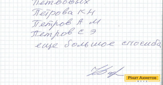 На адресу Ріната Ахметова й команди Гуманітарного штабу надійшов лист від жителя Пролетарського району Донецька. Він пише «з величезною вдячністю за ту допомогу, за ту добру справу», яку Штаб робить для Донбасу.