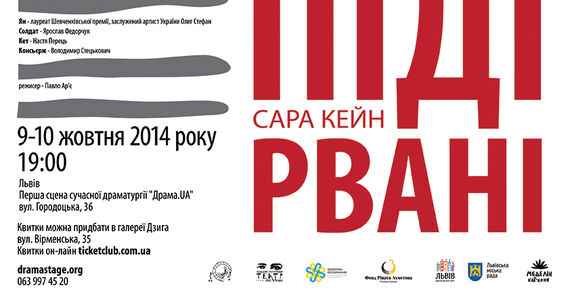 9 та 10 жовтня 2014 року ескізом вистави «Підірвані» Сари Кейн відкриється перший театральний сезон під назвою «Війна» Першої сцени сучасної драматургії «Драма.UA» (Львів). Проект організовує Мистецька Майстерня «Драбина» за підтримки Програми і³ [Ідея-Імпульс-Інновація] Фонду Ріната Ахметова «Розвиток України», Львівського драматичного театру імені Лесі Українки, програми Міністерства культури України «Взаєморозуміння» та Львівської міської ради.