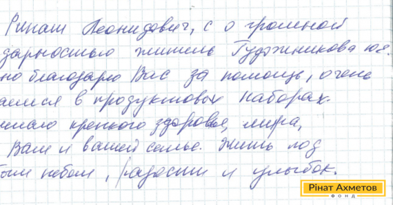 На адресу Ріната Ахметова прийшов лист від жителя пролетарського району Донецька. «Сердечно дякую Вам за допомогу, дуже потребуємо продуктових наборів», – йдеться в листі.