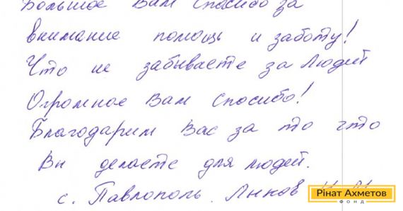 На адресу Гуманітарного штабу Ріната Ахметова прийшов лист із села Павлопіль. Місцеві жителі дякують Штабу за допомогу в скрутний час.