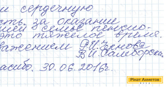 На адресу Гуманітарного штабу надійшов лист від родини пенсіонерів, які проживають у Центрально-Міському районі Макіївки. Вони дякують Рінату Ахметову й команді Штабу за надання допомоги в «цей важкий час».