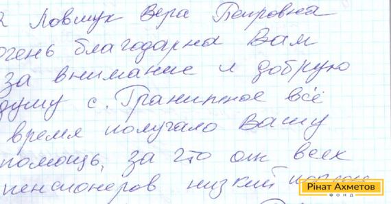 Село Гранітне Донецької області розташоване на самісінькій лінії фронту. Попри близькість бойових дій там продовжують жити люди – вони потребують допомоги, яку їм привозять волонтери Гуманітарного штабу Ріната Ахметова. Нещодавно до нас прийшов лист із Гранітного. Місцева мешканка дякує за надану допомогу.