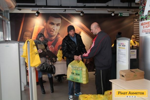 Видавання «дитячих наборів» від Гуманітарного штабу Ахметова на «Донбас Арені». 18.11.2014