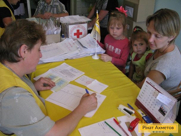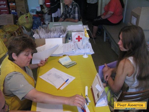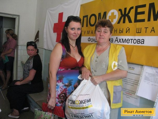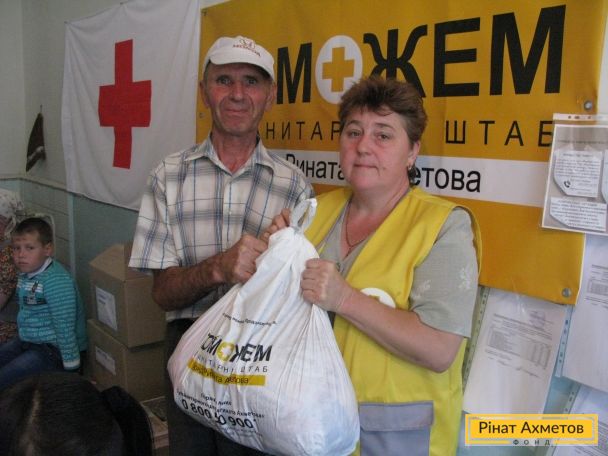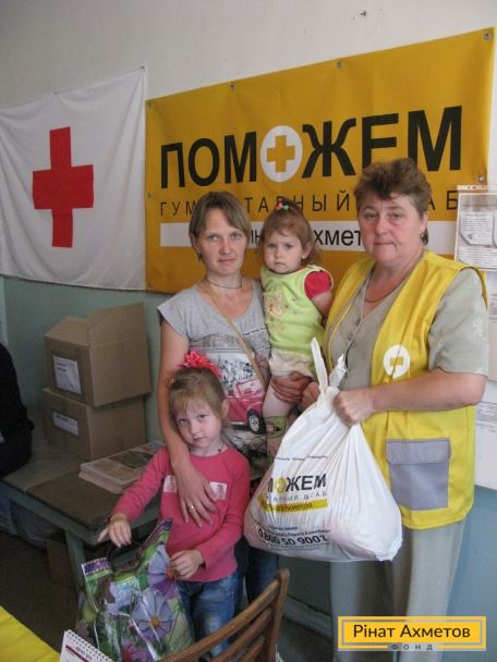 ФОТОЗВІТ. Переселенці, які тимчасово проживають у Димитрові, отримують продуктові набори від Гуманітарного штабу Ріната Ахметова