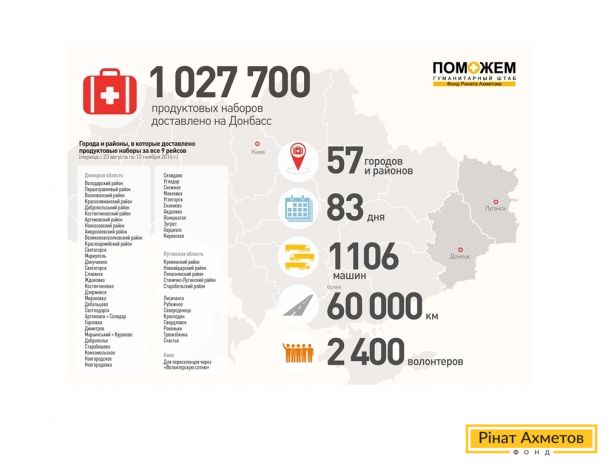 Гуманітарний штаб Ріната Ахметова доставив 1 027 700 продуктових наборів для жителів Донецької та Луганської областей. З 22 серпня до 12 листопада, за дев’ять Гуманітарних рейсів Ріната Ахметова, допомогу обсягом понад 10 тисяч тонн відправили у 57 міст і районів Донбасу. Організацією та розповсюдженням гуманітарної допомоги займалися кілька тисяч людей — співробітників Фонду Ріната Ахметова, активів Групи СКМ і волонтерів-добровольців.