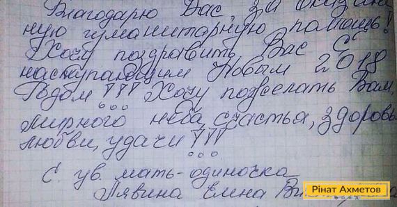 На адресу Гуманітарного штабу надійшов лист від матері-одиночки Олени Лявіної. Вона пише: «Дякую Вам за надану гуманітарну допомогу. Хочу привітати Вас із прийдешнім 2018 роком!!! Хочу побажати Вам мирного неба, щастя, здоров’я, успіху».