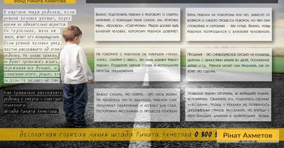 Одна з найчастіших проблем, з якою стикаються маленькі жителі зони АТО та діти-переселенці, — це втрата близької людини. Дітям складно усвідомити і прийняти смерть, а дорослі не завжди можуть підібрати правильні слова. Фахівці Психологічної служби Гуманітарного штабу Ріната Ахметова радять, як поговорити з дітками про смерть і полегшити їхні переживання.