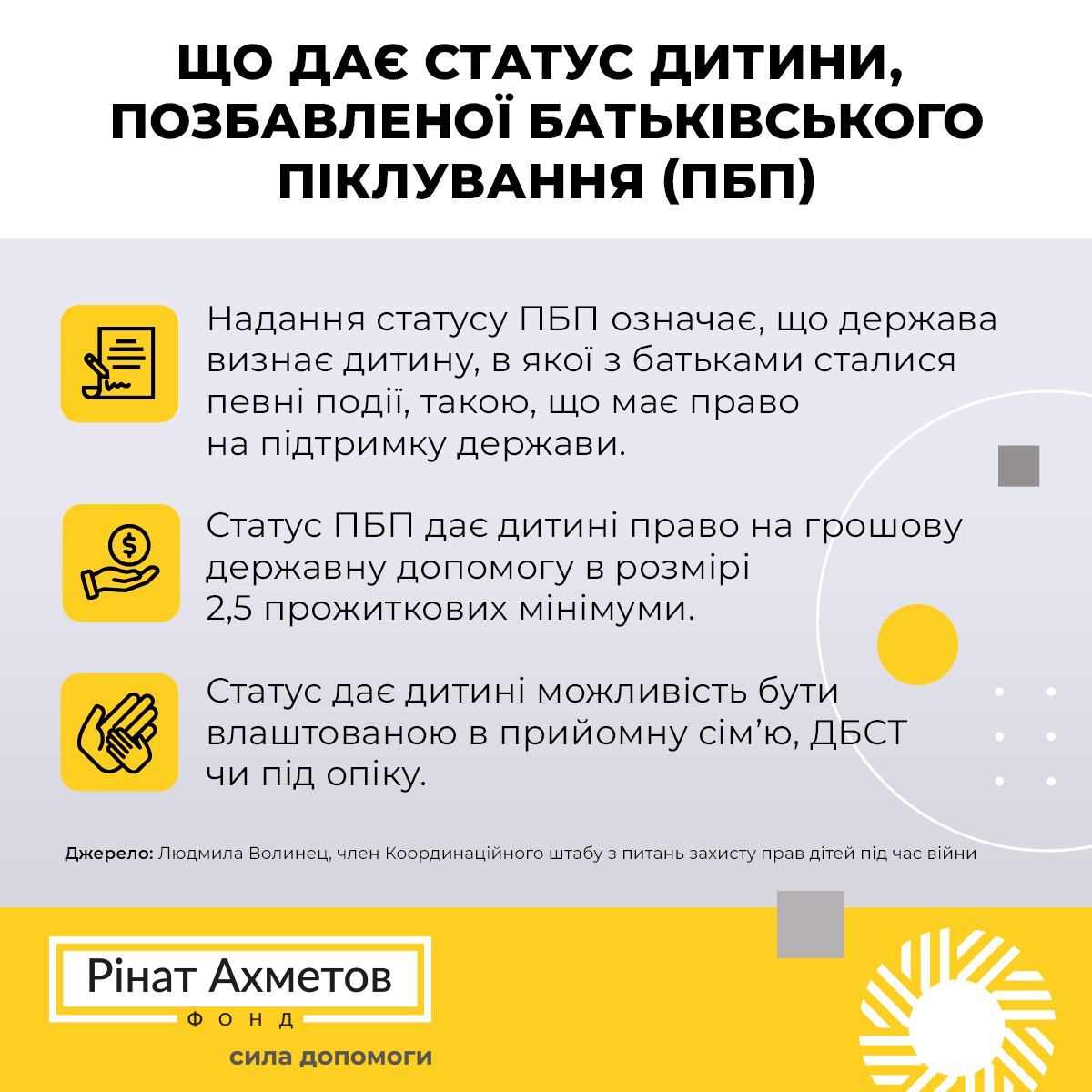 – Статус дитини, позбавленої батьківського піклування, означає, що держава визнає дитину, в якої з батьками сталися певні події, такою, що має право на підтримку держави.