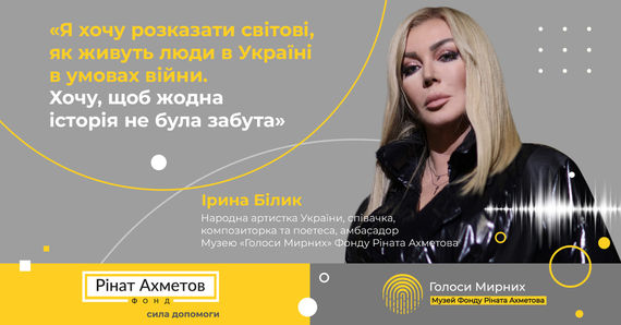 Народна артистка України, співачка, композиторка та поетеса Ірина Білик стала амбасадором Музею "Голоси Мирних" Фонду Ріната Ахметова – найбільшого у світі онлайн-архіву історій мирних жителів України, які постраждали від війни.