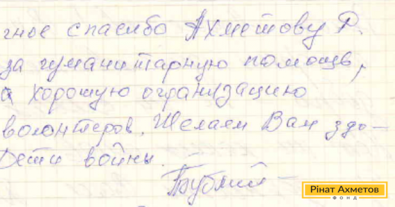 Зворушливий лист від стареньких, «дітей війни» з міста Світлодарськ Донецької області надійшов на адресу Ріната Ахметова й команди волонтерів Гуманітарного штабу.