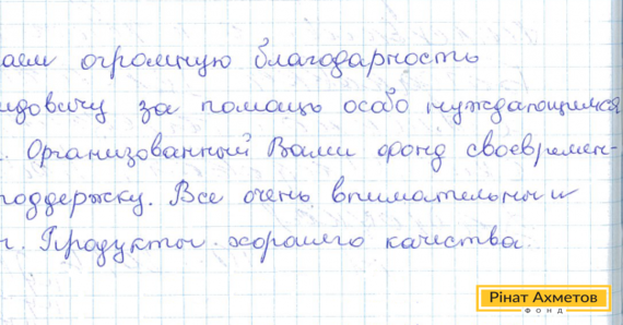 Такий лист від багатодітної матері із села Богданівка ми отримали незадовго до блокування роботи Гуманітарного штабу на непідконтрольній території. Жінка пише: «Висловлюємо величезну подяку Рінату Леонідовичу за допомогу особливо нужденним у воєнний час. Організований Вами Штаб своєчасно надає підтримку. Все дуже уважні й доброзичливі. Продукти доброї якості».