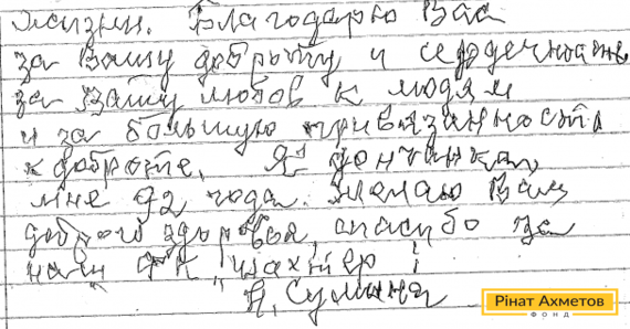 На адресу Гуманітарного штабу надійшов лист від 92-річної переселенки. Вона пише: «Рінате Леонідовичу, для мене ваша допомога – зайвий рік життя. Дякую Вам за Вашу доброту й сердечність, за Вашу любов до людей».