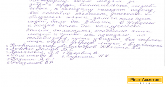 На адресу Гуманітарного штабу Ріната Ахметова прийшов лист від переселенців. Вони пишуть: «Майже два роки ми отримуємо допомогу й ми дуже, дуже, дуже вдячні волонтерам за добрі серця, вони уважні, чуйні, до кожного знаходять підхід, все спокійно пояснять, заспокоять і обслужать. Таких чудових людей було б в Україні побільше, і життя було б найкращим».