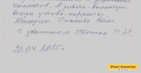 «Дуже вдячна волонтерам, які видають гуманітарну допомогу у ДК ім. Кірсанової. Я отримую допомогу тут із лютого на чоловіка-інваліда, і завжди дивуюся порядку, суворому контролю в усьому і ввічливому поводженню з людьми», — мовиться в листі.