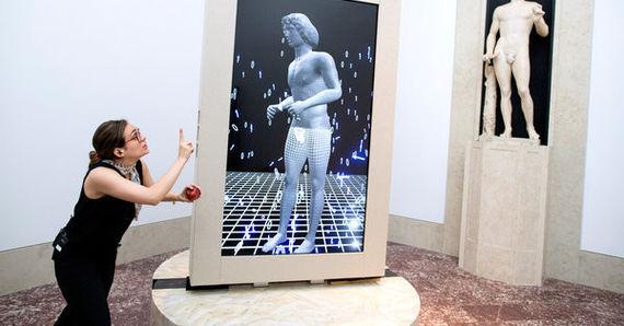 Поряд із самою статуєю встановлено екран у людський зріст, на якому транслюють її анімовану копію. За даними Digital Arts, кожний глядач може розпитати скульптуру про те, як її створювали, як вона подорожувала світом і як її реставрували.