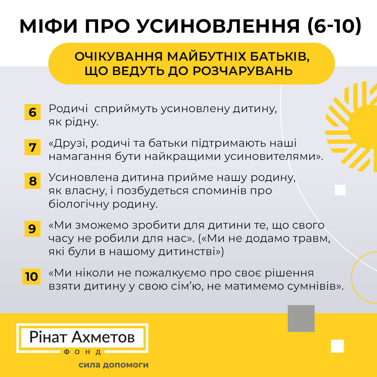 Програма “Рінат Ахметов - Дітям. Сирітству - ні!” завершує розбір очікувань (міфів) майбутніх батьків від експертки Джейн Скулер, аби зрозуміти, - як їх трансформувати і мати розчарувань.