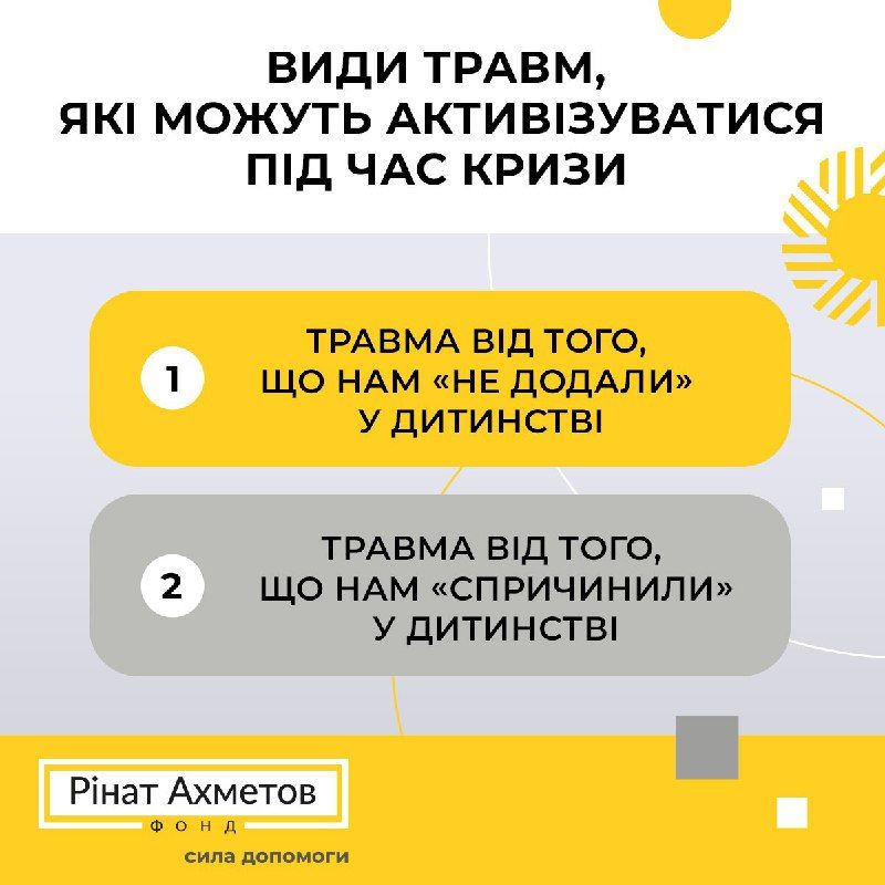 1 травма - спричинена тим, чого нам “не додали” - тобто коли ми не мали всіх благ життя в родині і не відчували прийняття в родині. Іноді нестача прийняття, що не додали нам батьки, настільки серйозна, що призводить до появи відчуття зневаги та знедоленості саме усиновителів у дорослому житті.