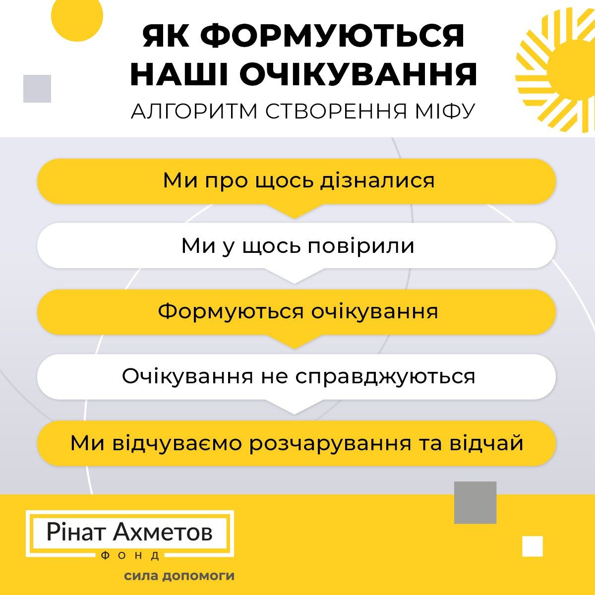 Якщо ми зрозуміємо модель створення міфу, ми навчимося звертати увагу на власні очікування та керувати ними, поки очікування не почали керувати нами.