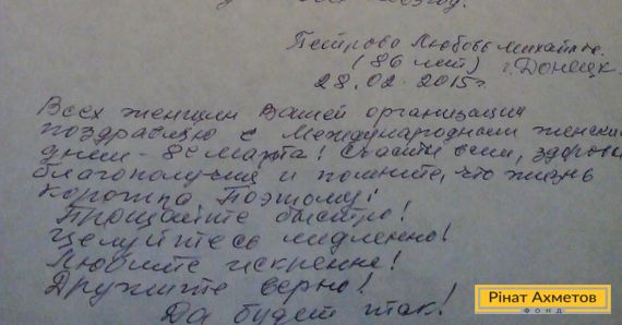 86-річна мешканка м. Донецька Любов Михайлівна передала подяку волонтерам і Штабу Ріната Ахметова за надану їй гуманітарну допомогу. Своє «спасибі» вона висловила у віршах.