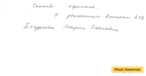 Лист Рінату Ахметову й команді Гуманітарного штабу прийшов від ветерана Великої Вітчизняної Війни. Марія Павлівна з Горлівки дякує за гуманітарну допомогу найменш соціально незахищеним жителям.
