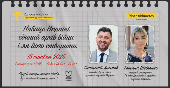 Музей «Голоси Мирних» Фонду Ріната Ахметова запустив платформу для обговорення майбутнього документації та архівування даних про війну. 15 травня до циклу публічних інтерв’ю долучаються Анатолій Хромов, Голова Державної архівної служби України та Тетяна Шевченко, перший заступник Голови Державної архівної служби України.