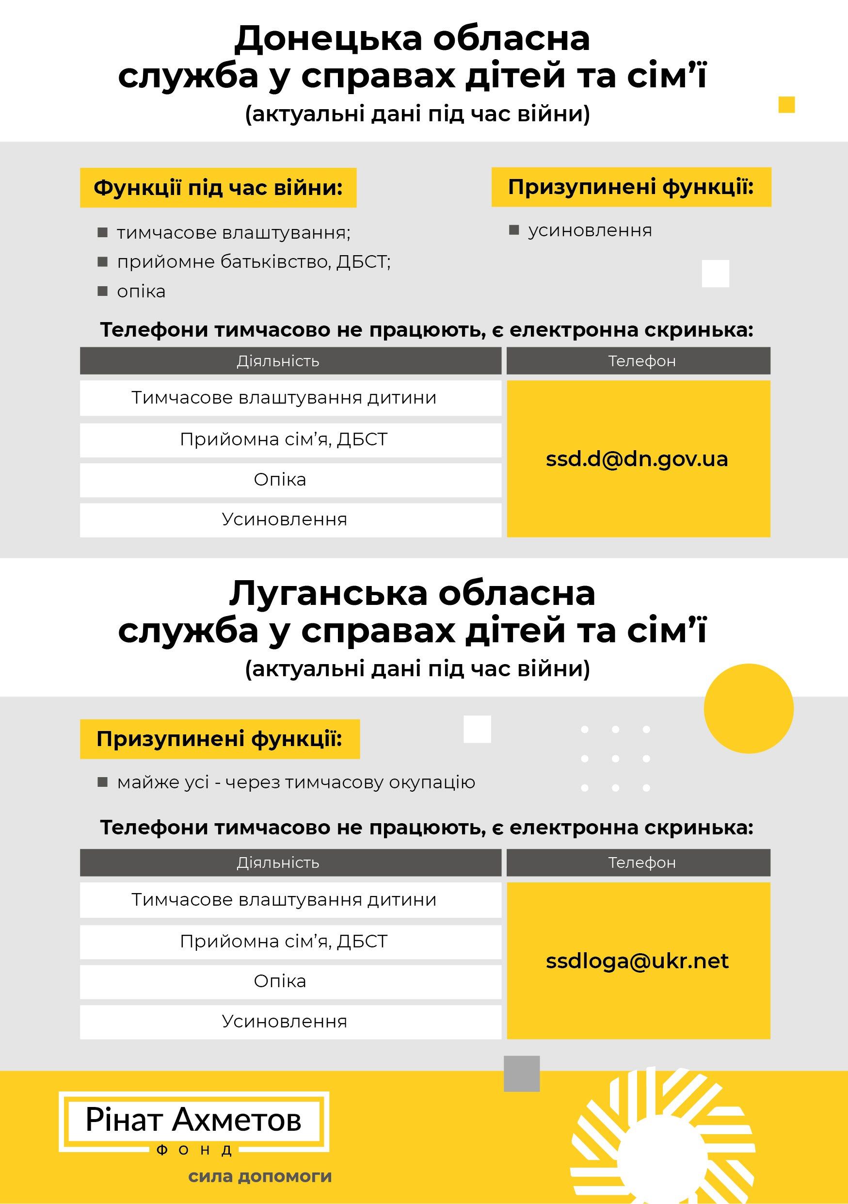 Через військові дії змінилися контактні телефони представників служб у справах дітей, які відповідають за усиновлення, опіку/піклування, тимчасове влаштування та прийомне батьківство. Тому програма “Рінат Ахметов - Дітям. Сирітству - ні!” вирішила зробити корисний онлайн-довідник з актуальними контактними даними усіх обласних служб у справах дітей України.