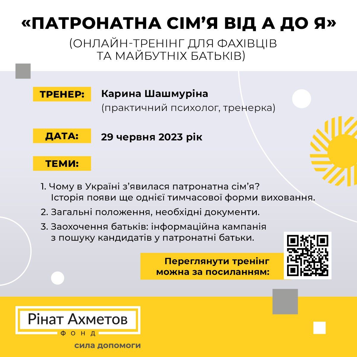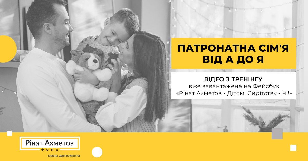 Відеозапис тренінгу «Патронатна сім’я від А до Я» від 29 червня 2023 року вже завантажений на Фейсбуці «Рінат Ахметов - Дітям. Сирітству - ні!».