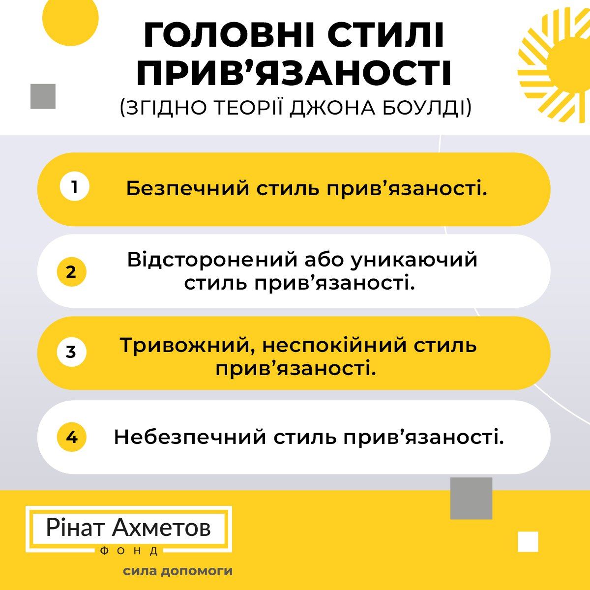 Наприклад, діти, яких батьки захищали та виявляли чуйність, знають, що вони того варті - мають ПОЗИТИВНЕ відношення до себе. А також вони знають, що на інших людей можна розраховувати - тобто мають ПОЗИТИВНЕ відношення до інших. Іноді дитячі переживання призводять до формування небезпечного стилю прив’язаності. Психолог Джон Боулді виділяє такі різновиди стилю прив’язаності.