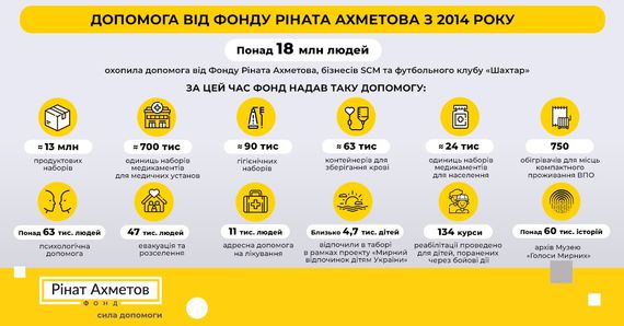 Допомога від Фонду триває і надається в рамках програми «Рінат Ахметов — Порятунок життів». З 2014 року допомога від Фонду Ріната Ахметова, бізнесів SCM та футбольного клубу «Шахтар» охопила понад 18 млн людей. Детальніше — за посиланням https://akhmetovfoundation.org/news/ponad-18-mln-lyudey-ohopyla-dopomoga-fondu-rinata-ahmetova-biznesiv-scm-ta-futbolnogo-klubu-shahtar-z-2014-roku