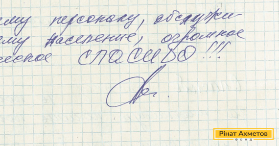 На адресу волонтерів Гуманітарного штабу Ріната Ахметова прийшов лист від жителя Ленінського району Донецька. Він пише: «Всьому персоналу, який обслуговує населення, величезне людське ДЯКУЮ».
