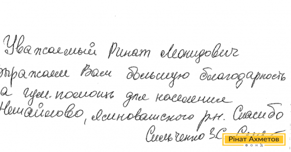 На адресу Гуманітарного штабу Ріната Ахметова із села Нетайлове від Сильченка З. С. надійшов лист-подяка за гуманітарну допомогу.