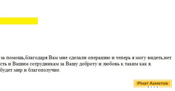 На адресу Гуманітарного штабу Ріната Ахметова прийшов лист від пенсіонерки з Маріуполя. Жінка пише: «Красно Вам дякую і Вашій команді за допомогу, завдяки Вам мені зробили операцію, і тепер я можу бачити, немає слів, щоб висловити Вам свою вдячність і Вашим співробітникам за Вашу доброту й любов до таких, як я».