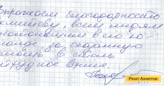 На адресу Гуманітарного штабу надійшов лист від жителя Донецької області: «Висловлюю подяку Ахметову, всім людям, які працюють у його команді, за надану допомогу в скрутні часи».