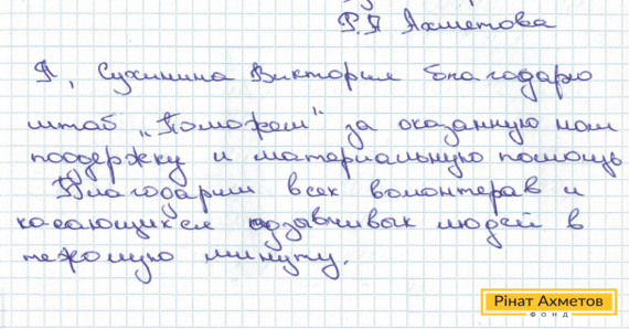 На адресу Гуманітарного штабу прийшов лист із непідконтрольної території. Вікторія дякує Штабу за надану допомогу й підтримку.