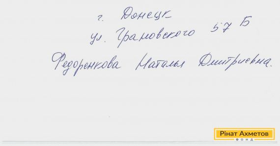 «Шановні співробітники Штабу Ріната Ахметова, від імені своїх численних родичів, які проживають у Петровському районі Донецька, і від себе особисто, висловлюємо глибоку подяку за надану допомогу продовольством. Саме завдяки Вам ми вижили й не померли від голоду в цей важкий для Донбасу час», — мовиться в листі Наталі Дмитрівни.