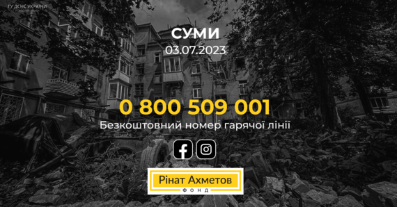 Сьогодні, 3 липня, росіяни вдарили безпілотниками по місту Суми. Внаслідок влучання у житлову п'ятиповерхівку загинула щонайменше одна людина. Фонд Ріната Ахметова готовий надати допомогу всім постраждалим унаслідок цієї атаки. А саме: