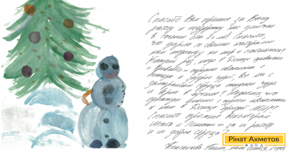 Штаб Ріната Ахметова вітає з Новим роком донеччанка Галина і її 2-річна дочка Еміль. Мама дівчинки пише: «Спасибі Вам величезне за Вашу турботу й підтримку нас, донеччан, упродовж цих двох років! Спасибі, що даруєте зі своїми наборами нам надію на мир і стабільність».