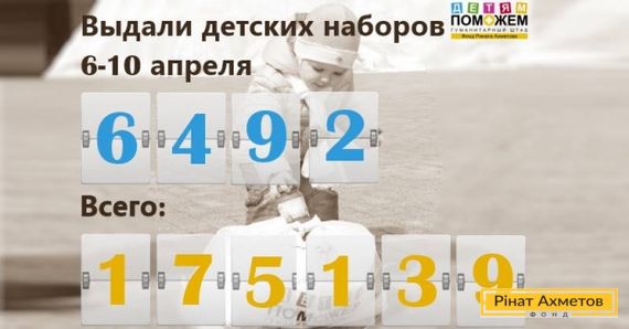 Минулого тижня, 6–10 квітня 2015 року, 6492 дитини до 2-х років, що проживають у Донецькій і Луганській областях, у межах проекту «ДОПОМОЖЕМО дітям» отримали дитячі набори від Гуманітарного штабу Ріната Ахметова.
